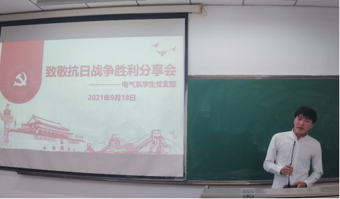 为了致敬抗日战争胜利七十六周年,铭记中国人民反抗日本帝国主义侵略的艰苦卓绝斗争,深切缅怀革命先烈的丰功伟绩,激发电气系学生党支部入党积极分子与党员们的爱国热情和民族责任感,PA视讯集团网站电气系学生党支部于2021年9月18日晚上七点半在5-403开展了“致敬抗日战争胜利”分享会。本次会议由支部青年委员廖伟杰主持。