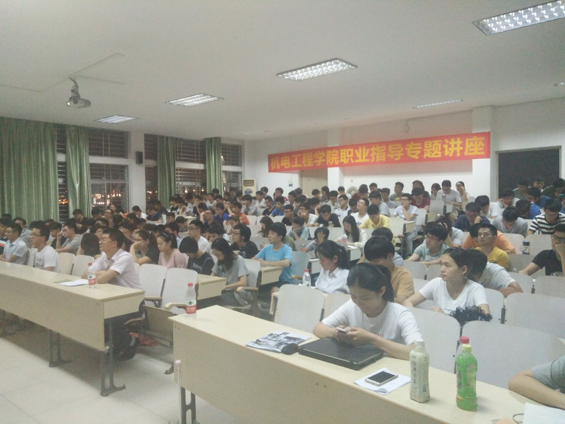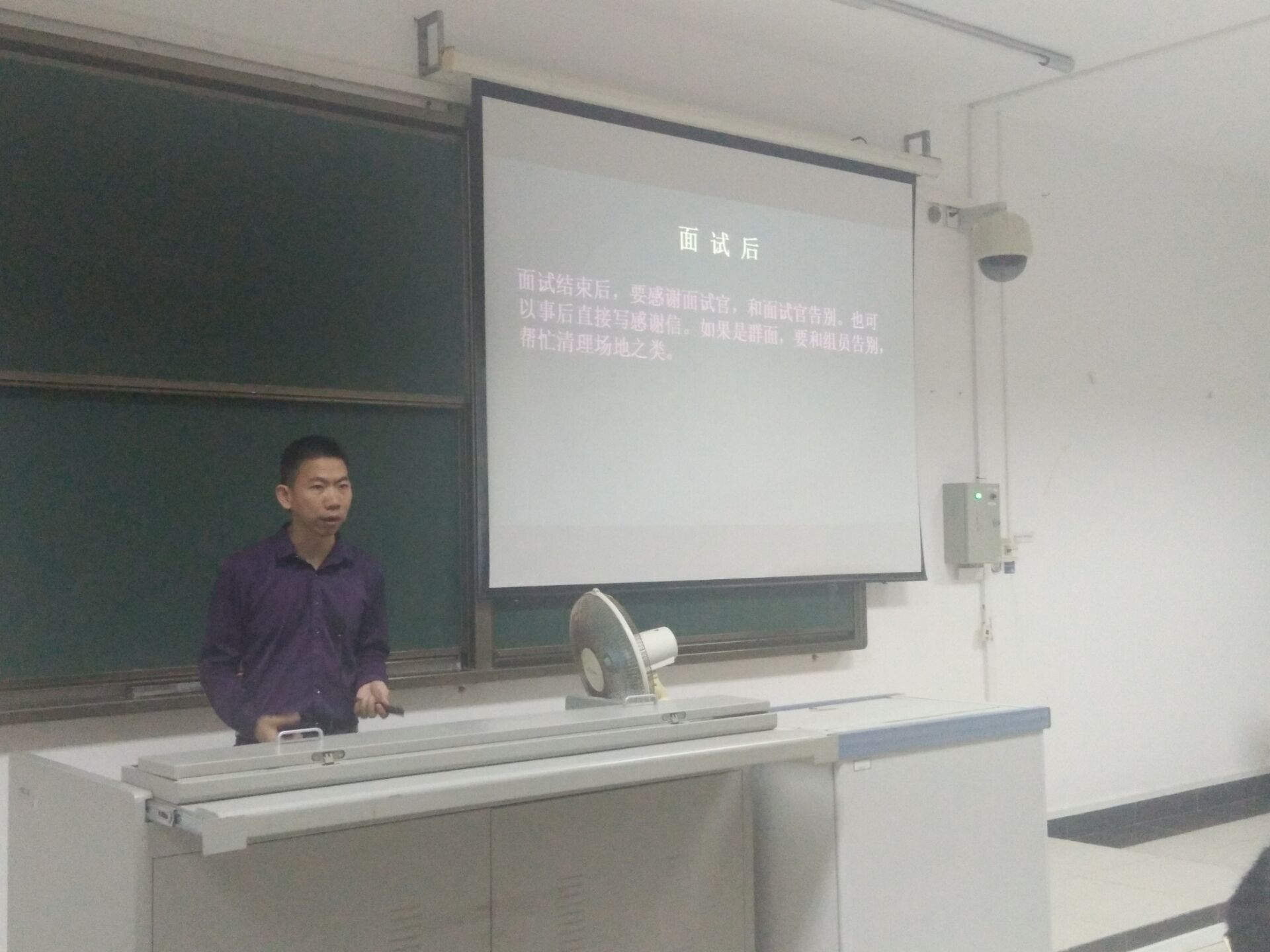 2017年5月9日,PA视讯集团网站职业指导专题讲座在三教学楼309教室成功举办。出席活动的有星火教育招聘专员杨志浩老师、学工办主任崔建兵老师、年级辅导员傅悦老师,2014级及报名求职模拟面试的同学近200人参加。