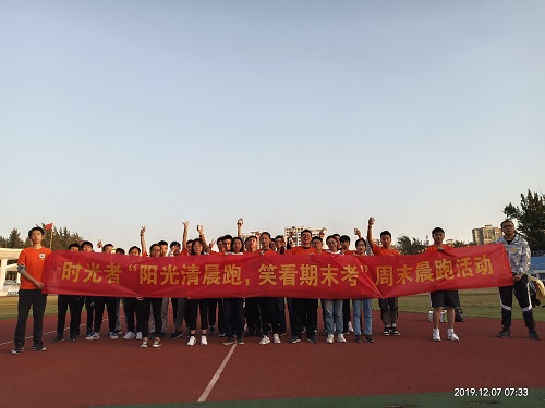 为督促同学们养成良好的生活作息,端正生活态度,鼓励同学们认真备战期末考,2019年12月7日上午7时,时光者策划组织了主题为“阳光清晨跑,笑看期末考”的晨跑活动。指导老师崔建兵、章梦琪,以及40余名同学参加。
