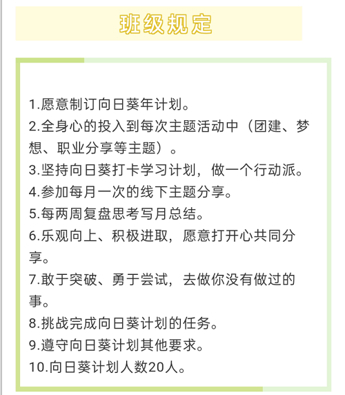 会上,崔建兵老师介绍了“向日葵”计划构建的初衷,希望科学系统的方法,一年365天的社群陪伴,12次线下活动组织策划,24次月总结汇编,来唤醒内心隐藏的力量,帮助你了解自己,认识目标,挖掘优势天赋,拓宽兴趣爱好,明确职业方向,坚定学习动力;崔建兵老师宣读了“向日葵”班级班规,帮助同学们制定了学习计划、学习目标,并希望同学们明确三点:一是要树立明确的大学愿景;二是明确自律与自由的区别,自由不是随心所欲而是一种拒绝能力;三是明确“不能者”与“不为者”,能从小事做起,持续努力奋斗做一名行动派。