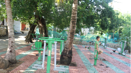 我们在抱板村进行走访的过程中发现村子里娱乐设施也十分齐全,在村委会的庭院中配备有排球场和篮球场,傍晚时分村民也会自发地进行文体娱乐活动。在村子的两侧也有相对齐全的健身设施。在村子中心也有一个供村民休息和开展活动的凉亭。