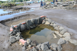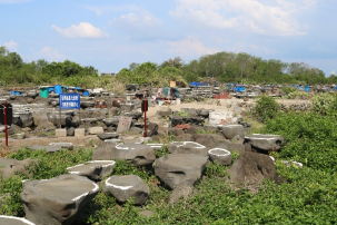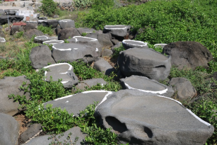 致远实践调研团在一位热心村民的介绍下,了解到:这片古盐田有750亩,距今已有1200多年历史,传说是从福建莆田迁移而来的盐工所造。盐工们就地取材,将海边大片的天然火山岩石削去一半,凿成无数浅浅石槽,像一方方砚台比肩伫立,有些上面还雕凿着古朴的文字,错落有致地分布镶嵌在一垄垄、一块块的盐田周围,总数达6800多槽,蔚为壮观平时在石槽中注入经过滤后的海水让烈日曝晒成盐。