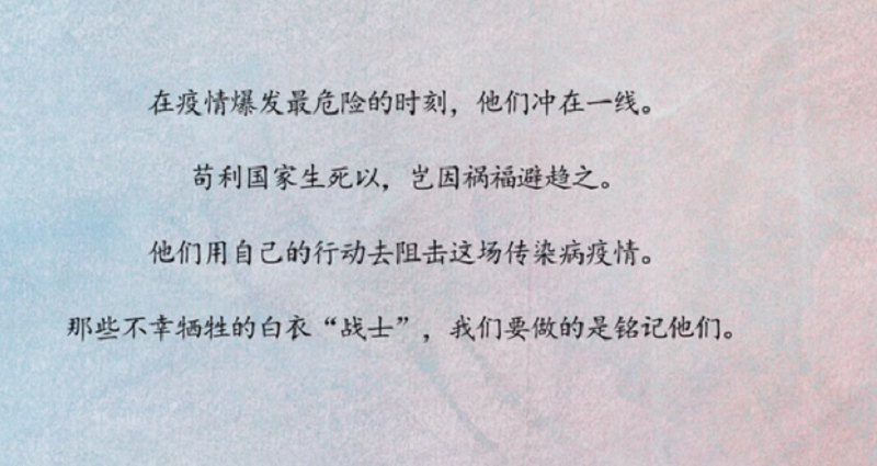“哪里有什么白衣天使,不过是一群孩子换了一身衣服,学着前辈的样子,救治病人与死神抢人罢了。”你们是英雄,是天使,愿世间美好与你们环环相扣。没有生而英畏,只是选择无畏战“疫”不问职业,奉献不分大小,群众有需求,就有他们的身影。他们也是孩子,是人民,但他们选择了无畏,赌上了性命,换来了一个称谓——英雄。