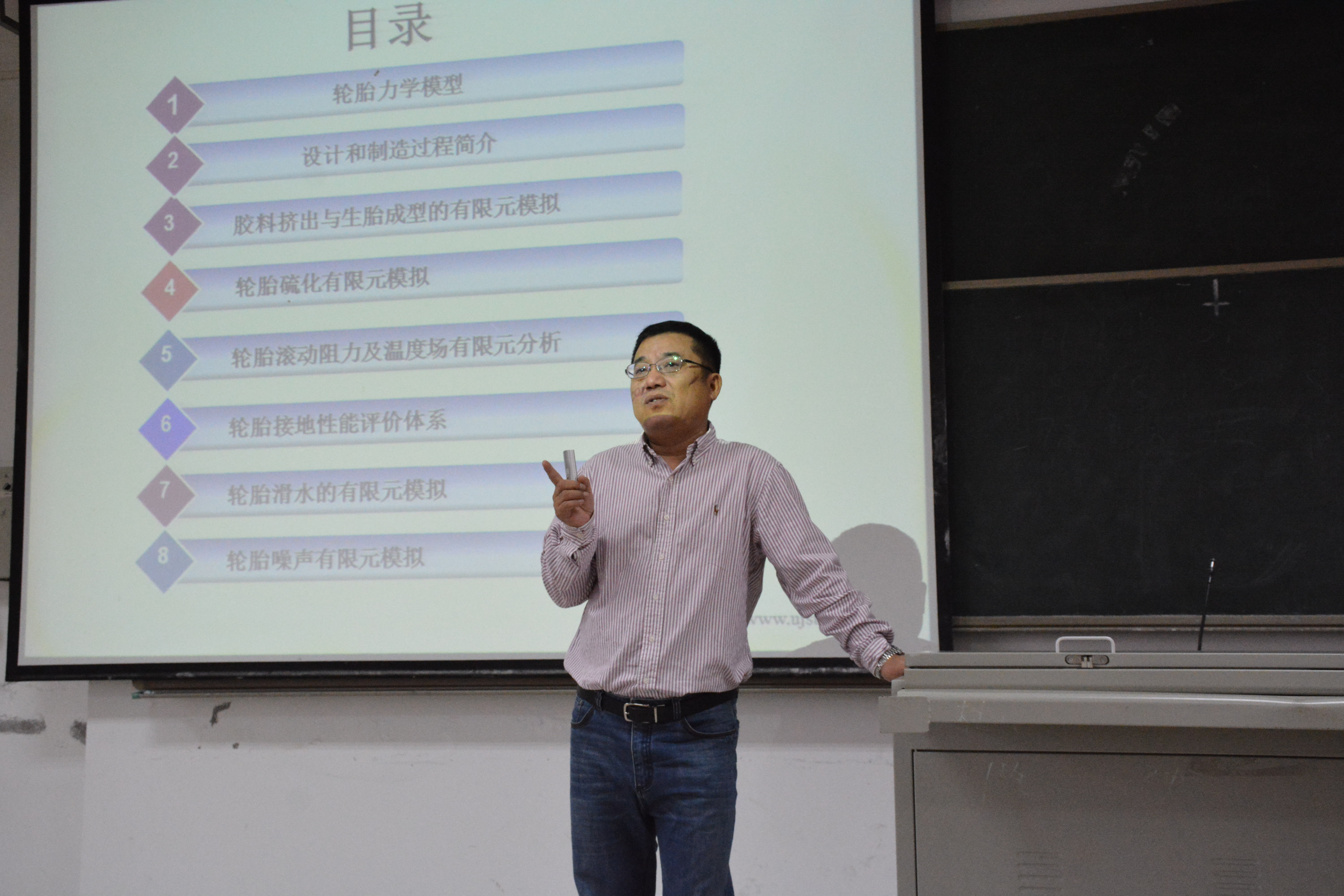王教授主讲的课题是“轮胎产业中的CAE技术应用”, 课程围绕“轮胎力学模型”,讲解了轮胎的性能、要求以及开发的过程,并结合汽车与轮胎的关系,进一步阐述了轮胎的结构以及功用。为了开拓学生的视野,王教授还为同学们讲授了汽车的发展史以及汽车仿真和噪声方面的知识。王教授将理论研究和课题研究紧密结合,通过深入浅出的讲解,赢得了同学们的阵阵掌声。授课期间,王教授还注重与同学们的互动,引导学生提出问题、思考问题,解答疑问。