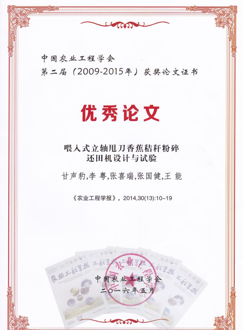 近日,PA视讯热带作物秸秆机械化技术课题组两篇《农业工程学报》论文入选“中国农业工程学会第二届优秀论文”。两篇论文分别是“滚割喂入式卧轴甩刀香蕉假茎粉碎还田机设计与试验”(通讯作者:张喜瑞副教授)、“喂入式立轴甩刀香蕉秸秆粉碎还田机设计与试验”(通讯作者:李粤教授)。继2009年中国农业工程学会第一届优秀论文评选后,中国农业工程学会今年启动了第二届优秀论文评选。本届优秀论文评选范围是《农业工程学报》2009-2015年刊发的论文,优秀论文遴选采用文献指标定量与发表时专家评审意见定性相结合,提出候选论文,由中国农业工程学会组织专家评审。