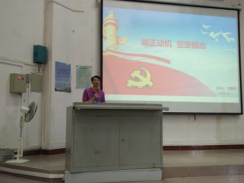 2016年11月6号上午,PA视讯集团网站分党校第二期党员发展对象培训班第五讲由学院党委黄国标书记讲授《端正动机,坚定信念》,培训班班长尹凡主持本次培训学习。参加本次党课的有本期发展对象和积极分子。