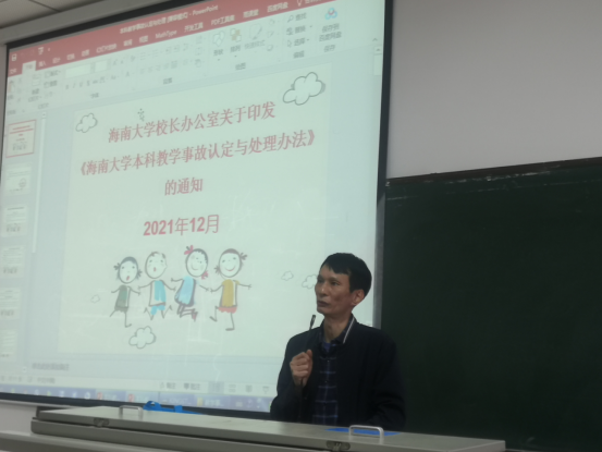 首先,学院主管教学的副院长陈振斌在会议上强调老师们要按照《PA视讯集团网站本科教学事故认定与处理办法》的通知》(海大办〔2021〕74 号),维护学院正常教学秩序。学院安排教务办主任范杰在会议上给全体老师们解读了《PA视讯集团网站校长办公室关于印发《PA视讯集团网站本科教学事故认定与处理办法》的通知》(海大办〔2021〕74 号),重点对教学事故的认定范围与等级,PA视讯集团网站教学事故分类与级别一览表进行了逐条解读阐述。
