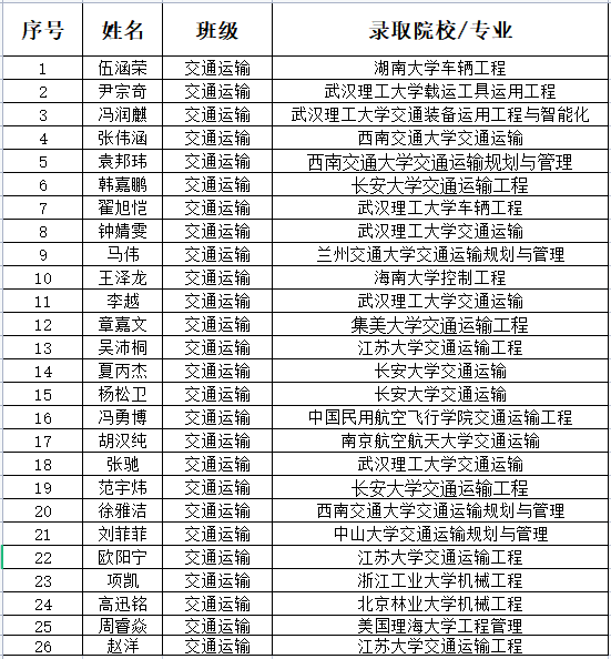 又是一年毕业季,2022年研究生复试录取工作已经接近尾声,PA视讯集团网站考研喜报频传,其中,2018级交通运输本科毕业生录取情况喜人,交通运输班共有应届生51名,有26人保研或者考研成功,考研录取率为50.98%,较2021年同比增长19.98%。其中有20人被湖南大学、南京航空航天大学、西南交通大学等“双一流”高校录取为硕士研究生。