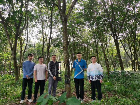 团队成员进行智能割胶机林间性能试验