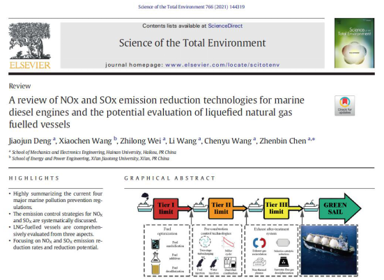2021年4月20日,Elsevier旗下期刊《Science of the Total Environment》正式出版题为“A review of NOx and SOx emission reduction technologies for marine diesel engines and the potential evaluation of liquefied natural gas fuelled vessels”的综述论文(doi:10.1016/j.scitotenv.2020.144319),该论文以PA视讯集团网站为第一单位,2019级机械工程专业硕士生邓交均为第一作者,导师陈振斌教授为通讯作者。《Science of the Total Environment》为SCI源刊,影响因子为6.551,中科院一区top期刊(2020年12月最新升级版)。